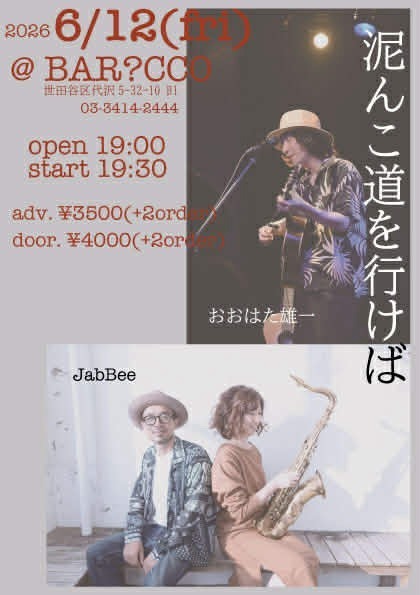 【イベント出演】下北沢・BAR? CCO「泥んこ道を行けば」おおはた雄一/JabBee
